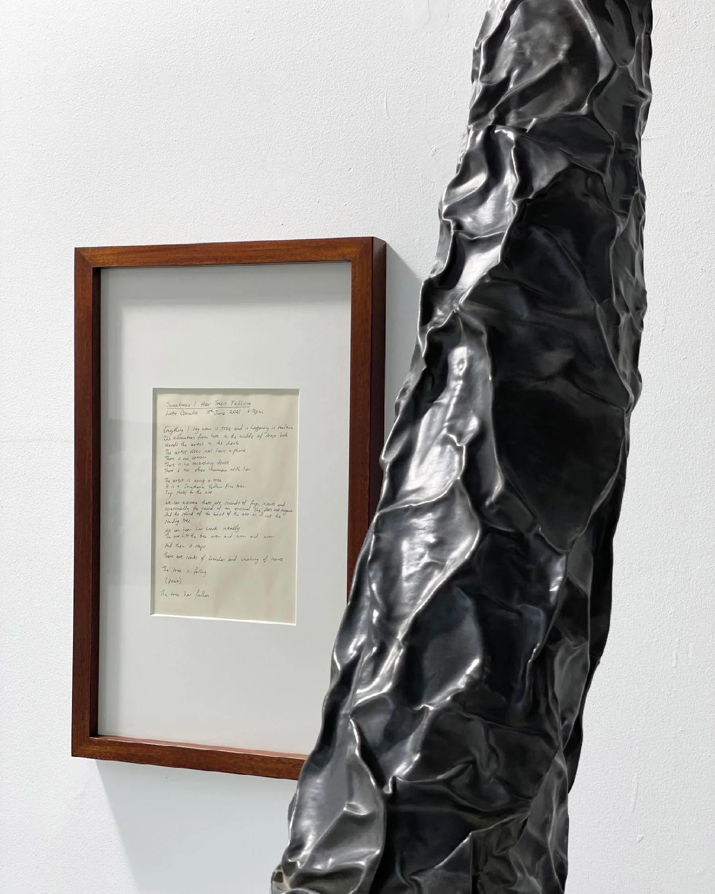 For the performance Sometimes I Hear Trees Falling an audience gathered in Dominik Mersch Gallery in Sydney and stood waiting for the artist to come out and perform. In the artists place the gallery manager stood and read this handwritten text aloud as the artist cut down a tree synchronised with the words spoken. The performance playing out in the minds of the audience in the middle of a white cube in the city and deep in the bush in the dark where the artist stood cutting the tree.